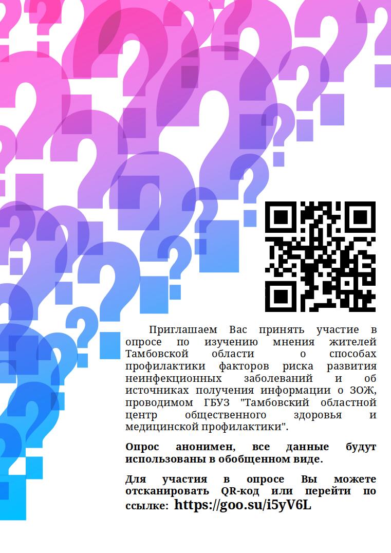 Приглашаем Вас принять участие в опросе по изучению мнения жителей Тамбовской области о способах профилактики факторов риска развития неинфекционных заболеваний и об источниках получения информации о ЗОЖ, проводимом ГБУЗ "Тамбовский областной центр общественного здоровья и медицинской профилактики" с 9 декабря 2024 г. по 31 января 2025 г.